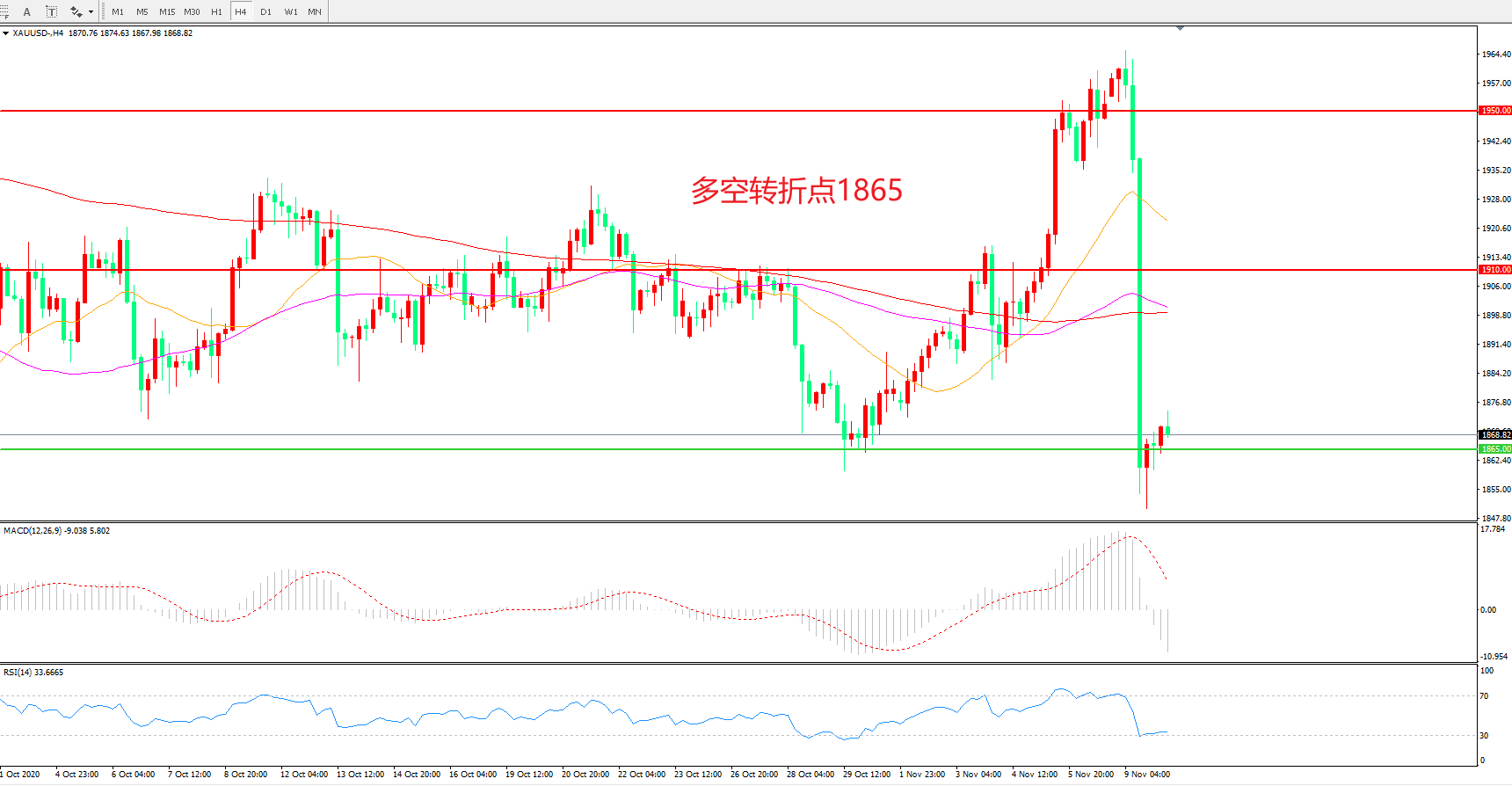 周一(11月9日),新冠疫苗突现重大利好,美国辉瑞制药和德国合作伙伴宣布,其新冠候选疫苗的第3期临床试验中期分析取得重大进展,疫苗有效率超过90%,现货黄金盘中一度触及1965.61美元的近两个月高位,在新冠疫苗消息出炉后迅速走低,较昨日收盘价跌超100美元,小幅回调后报1870.44美元/盎司。
