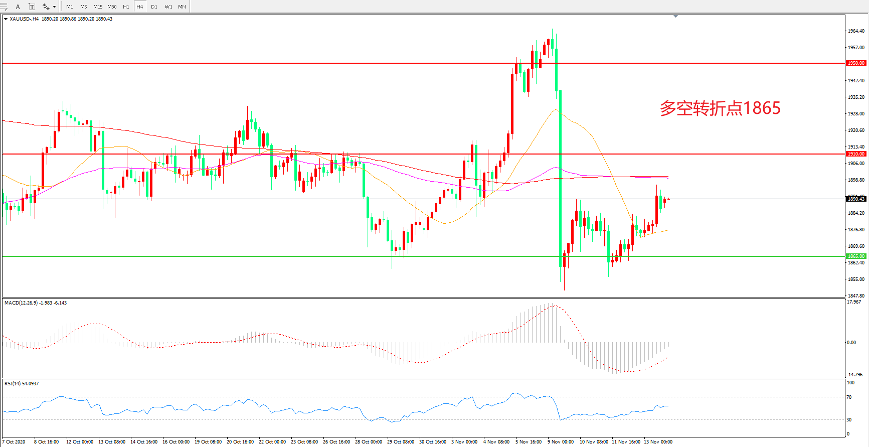上周现货黄金先扬后抑,周初拜登胜选提振了黄金表现,金价一度升至1965美元/盎司,但疫苗的突破性进展市场令风向骤然改变,黄金重挫近百美元,周五美元再度走软,黄金大涨20美元后收报1885.98美元/盎司。
