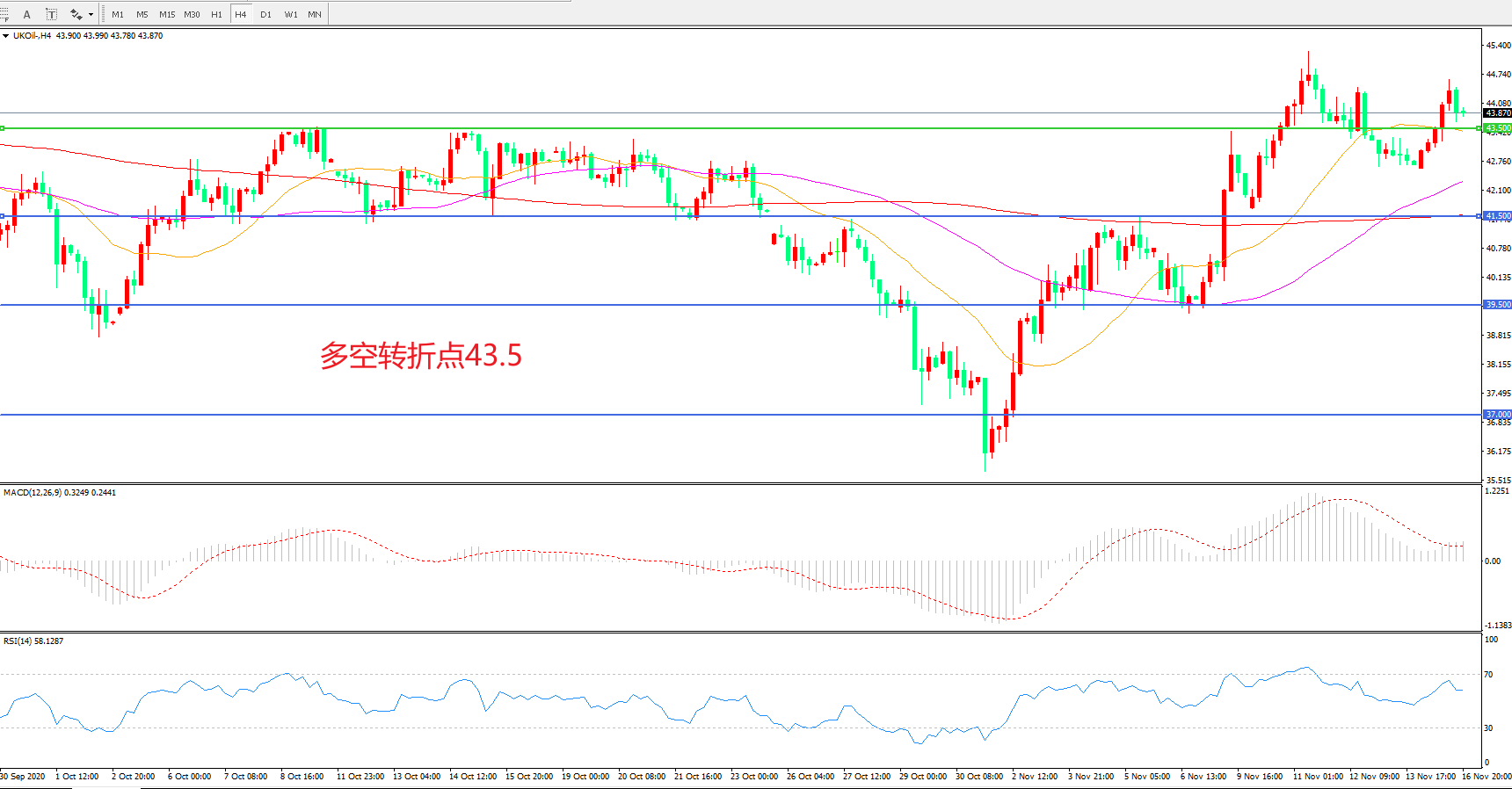 周一(11月16日),继辉瑞和俄罗斯疫苗之后,此前一度较为高调的莫德纳也宣布了好消息,其疫苗在预防方面的有效性超过94%,市场风险情绪回暖,国际油价扭转了连续两日下跌的势头,布伦特原油大幅拉升,收报43.87美元/盎司。