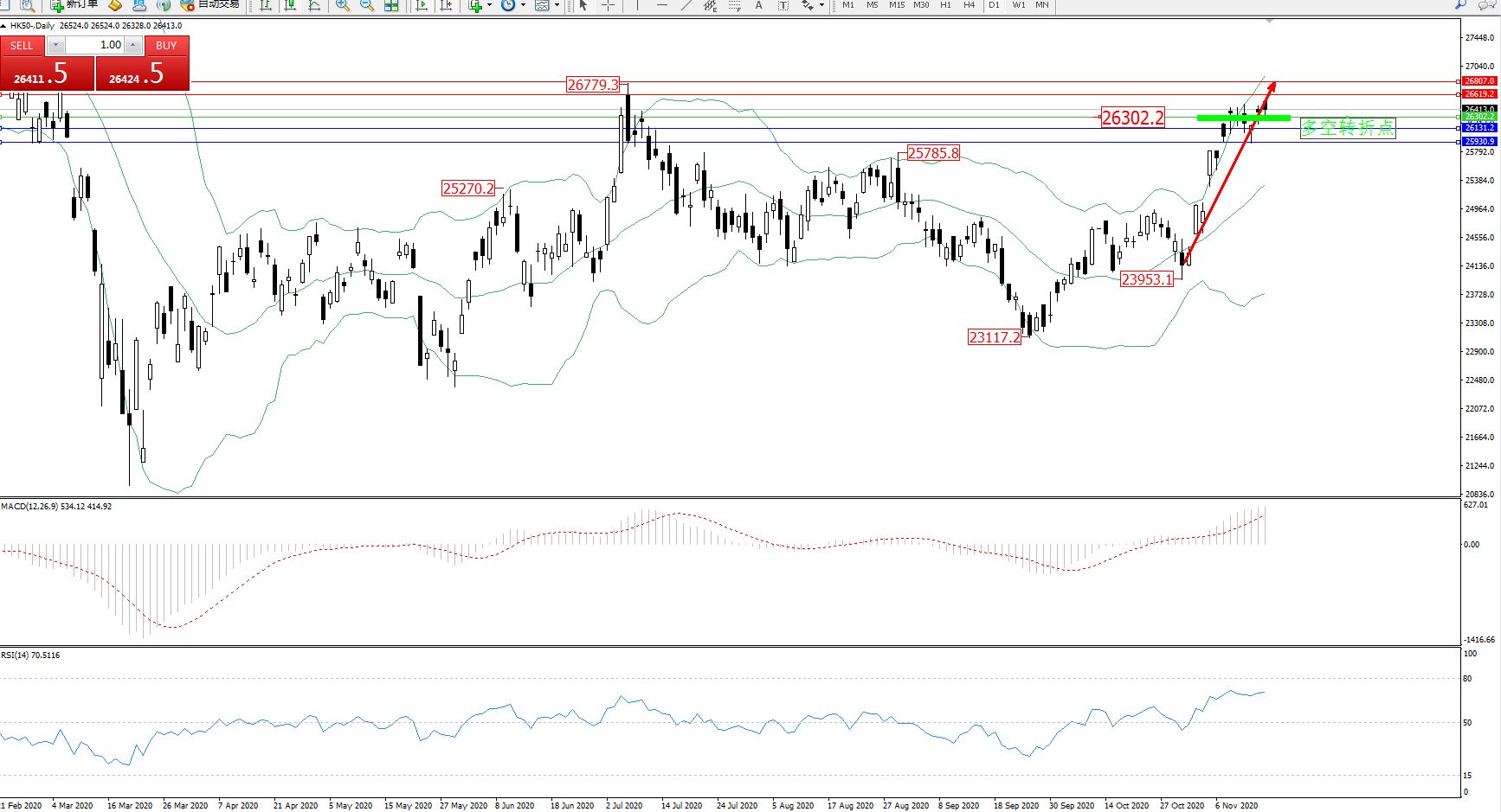 香港恒生指数11月17日(周二)收盘上涨33.42点,涨幅0.13%,报26415.09点;港股恒指全天窄幅震荡,科技股弱势,致恒生科技指数跌1.77%。疫苗再传利好,航空股、石油股、港口航运股均走强,中外运大涨超11%,国泰航空涨7%;香港本地股、保险股、内银股普遍走高;大型科技股下挫,京东跌超7%,美团、小米跌超4%,腾讯、阿里、网易皆有跌幅;电池板块领跌,比亚迪股份跌超5%;抗疫概念板块普遍下挫,复星医药跌近8%;今日南下资金净流入10.26亿港元,大市成交额为1435亿港元。大摩发研报指,在新冠肺炎疫苗的发展下,有助国际航空旅游业复苏,预期行业于明年第三季起逐步复苏,而强劲的压抑需求会在明年第四季带动中国航空公司恢复盈利。未来3-6个月中国航空业的基本面维持疲弱,因国内游随时会因疫情发展而受影响;直至国际线复苏前,供应过剩情况会持续;廉航继续抢占市场份额。一旦中国旅游限制解除,相信短期国外旅游需求强劲,再加上本地需求持续复苏,有助推高客座率和收益率,料情况会在明年第四季出现,相信三大内地航空股明年可回复至收支平衡或盈利状况,大摩上调内地三大航空股及国泰评级至“增持”,该行将航空股目标价平均上调26%。