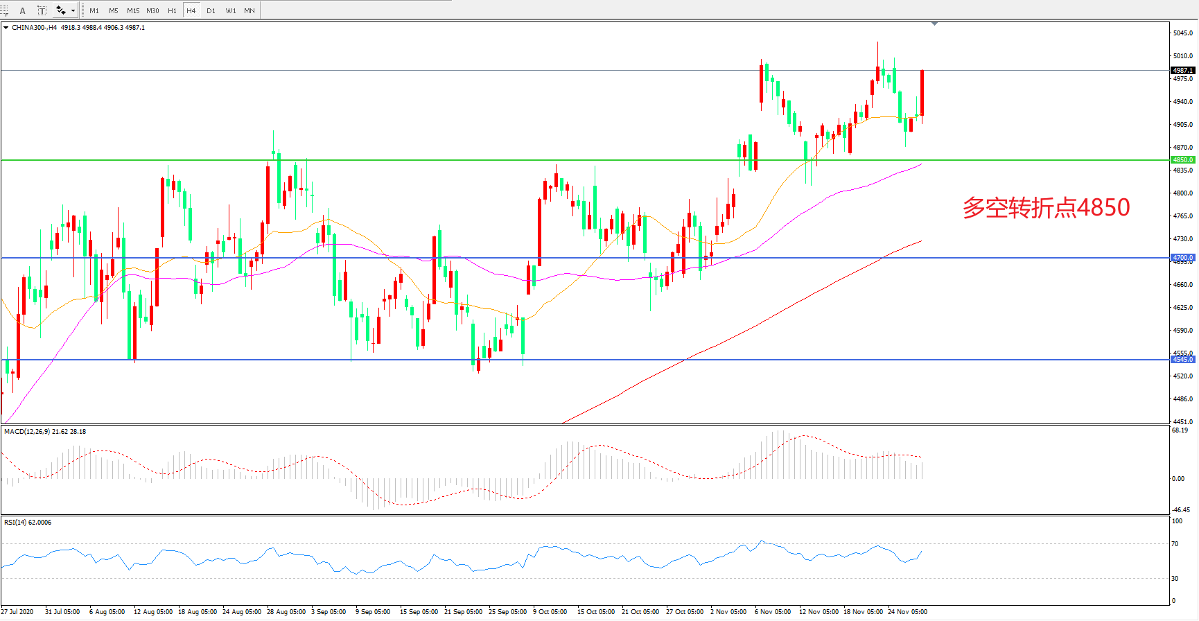 4小时图看,沪深300长阳拉升,短期走势有所回暖,21周期均线成为短期支撑,5000成为上方阻力,MACD红柱增加,RSI指标向上,日内延续震荡概率较大。