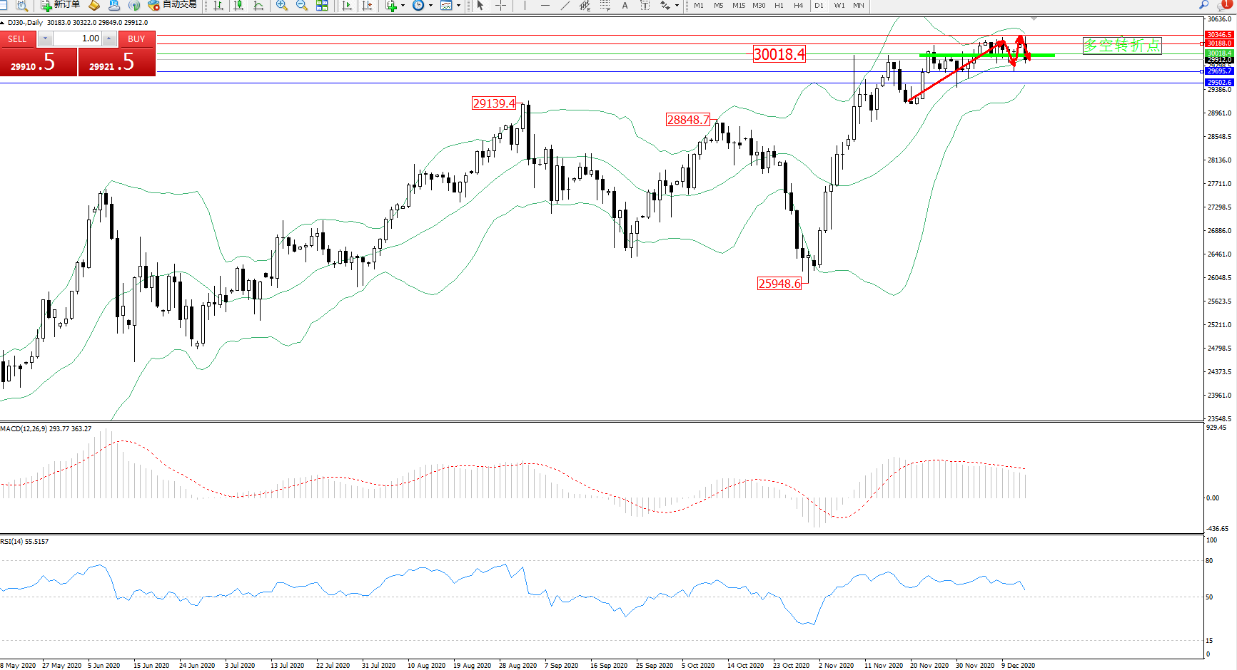 道琼斯指数12月14日(周一)收盘下跌184.80点,跌幅0.62%,报29861.55点。美股三大指数收盘涨跌不一,美元指数跌0.28%至90.72;盘中稍早一度低见90.419,为2018年4月以来最低;美国股市则由涨转跌,投资者评估联邦支出计划的前景以及进一步防疫封锁的可能性。在其他一些国家开始全国性疫苗接种之际,美国也开始首批新冠疫苗接种,因新冠疫苗方面取得进展,且美国可能出台援助计划。欧洲的防疫限制措施加强以及纽约市可能全面封锁导致市场陷入避险心态。投资者乐观预期美国两党议员可能在周一宣布9080亿美元的疫情纾困计划,尽管一位谈判人员表示,“无法保证”国会将批准该计划。