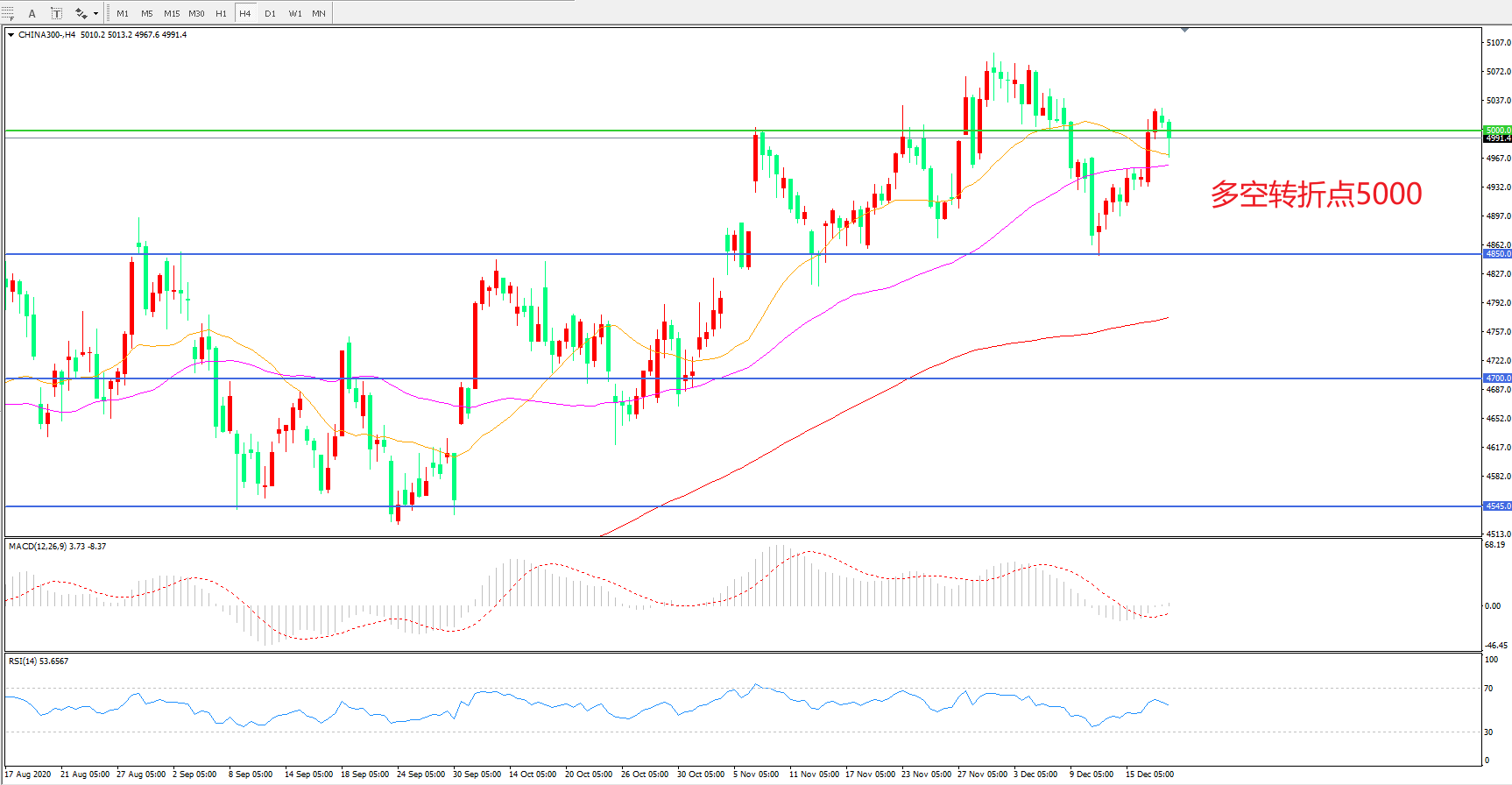 4小时图看,沪深300突破5000阻力后小幅回落,短期涨势暂缓,但均线系统依然成为下方支撑,MACD绿柱减少,RSI指标走平,日内震荡上行概率较大。