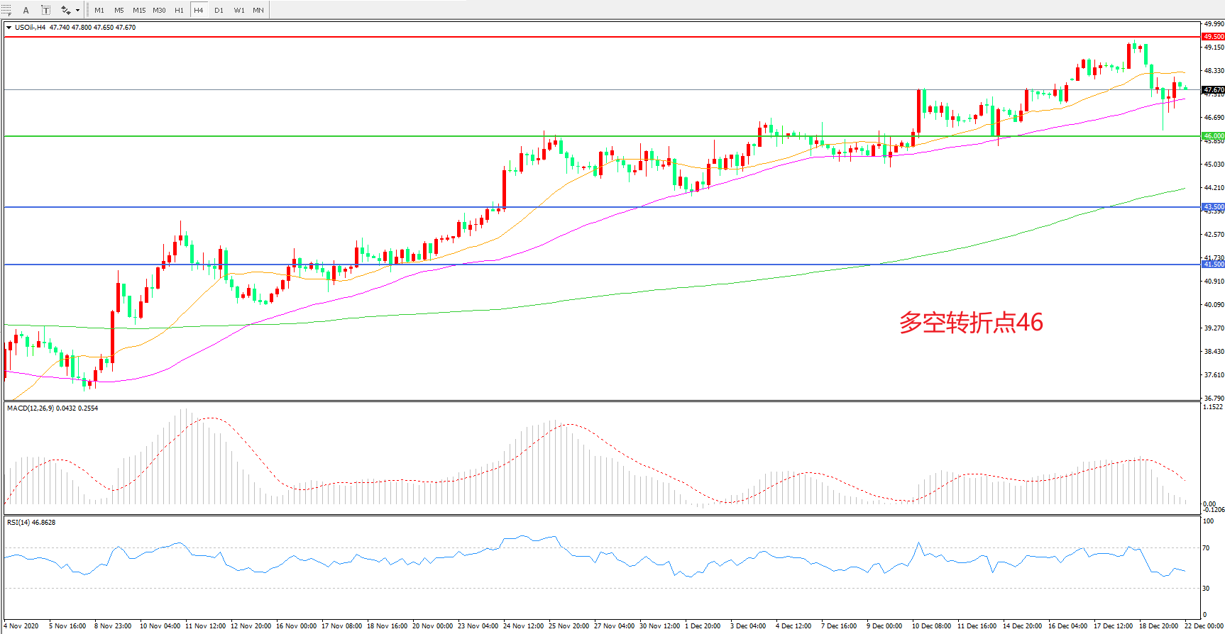 周一(12月21日),由于英国发现的变异新冠病毒毒株,市场担心新的一轮疫情来袭导致更多封锁,油价一度大幅下挫,但俄罗斯表态仍可能推动进一步缩小减产的规模,美国WTI原油小幅回升,收报47.74美元/桶。综合来看,市场的回调情绪仍然没有消退,不排除未来几天原油价格再度下跌的可能。