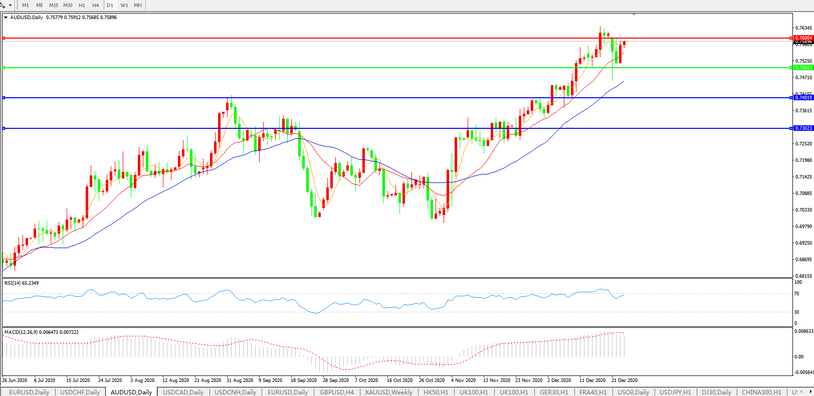 交易策略:0.7500上方看涨,目标0.7600、0.7700