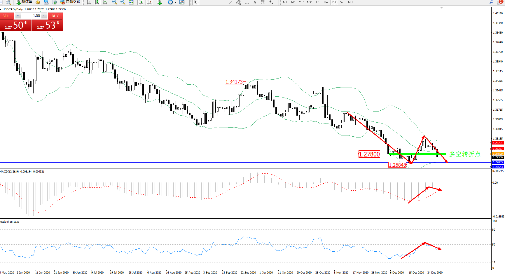 美元兑加元下跌0.47%至1.2758,受到石油价格从下跌中反弹提振。,带动与油价关联密切的加元一同走高,同时年底之际,在对明年全球经济预期乐观的背景下,市场的洗盘交易也令投资者加速出脱避险美元多头头寸,这令加元汇价迎来额外利多推动;由于美国财政政策在新政府上任之后继续存在不确定性,美元指数下行趋势仍在延续当中,这意味着加元在进入2021年后续涨动能犹存,尤其是在全球能源需求进一步复苏的带动下,美元兑加元汇价将有望再度下探至2018年2月以来从未触及的1.25低位。