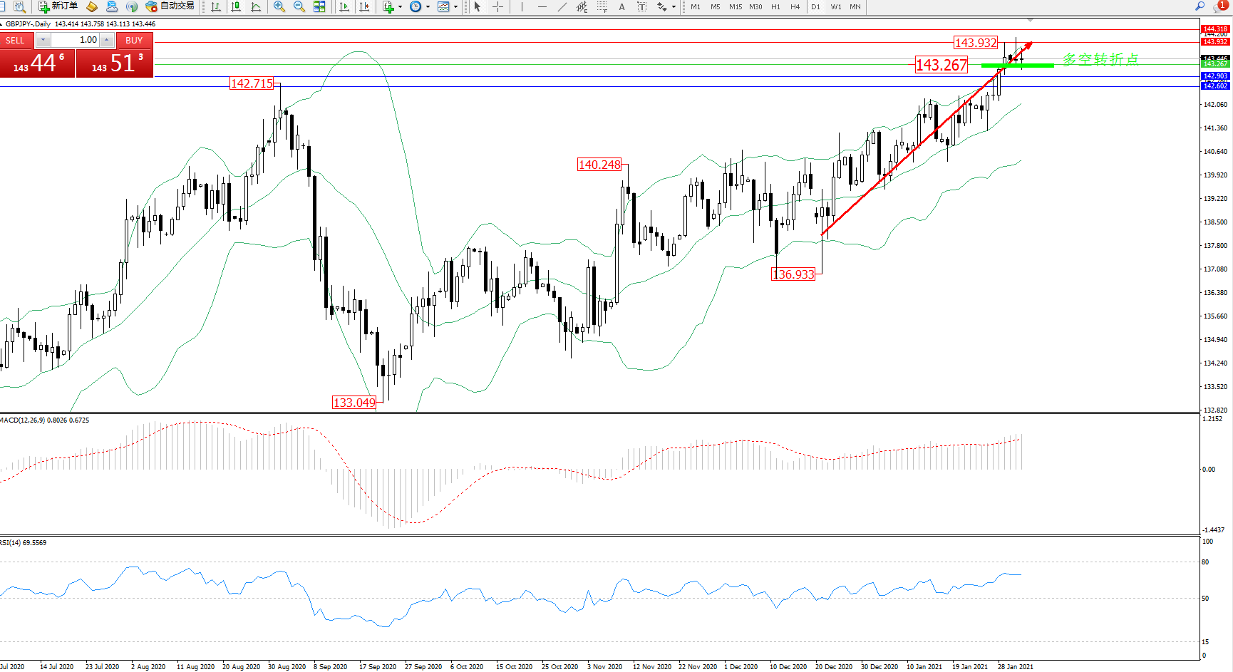 英镑兑日圆处于高位143.521附近整理,英国央行将于周四晚20:00公布利率决议和货币政策报告,市场一致预期是政策保持不变,利率将维持在0.1%,尽管风险依然存在(苏格兰独立公投的负面消息;如果英国政府选择背离欧盟劳动法所面临的关税风险)。市场押注英国施打疫苗进展较快,以及复苏层面较广,在市场乐观看待英国施打新冠疫苗进度领先之际,将希望寄托在英国复苏脚步相对快过疫苗施打进度落后的地区,例如欧陆。同时英国央行也推迟市场对于该行实施负利率的预期。英国疫苗接种速度较快,2021年第二季度复苏可能更为强劲,以及英国央行(相对于欧洲央行)鸽派程度较浅。