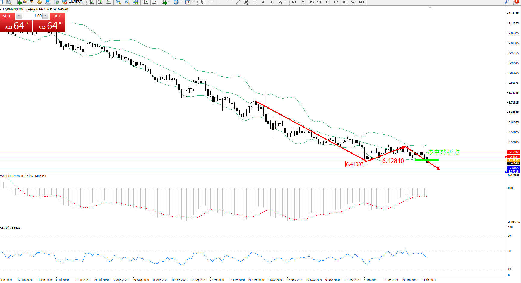 交易策略:6.42840下方看跌,目标6.39055、6.37318