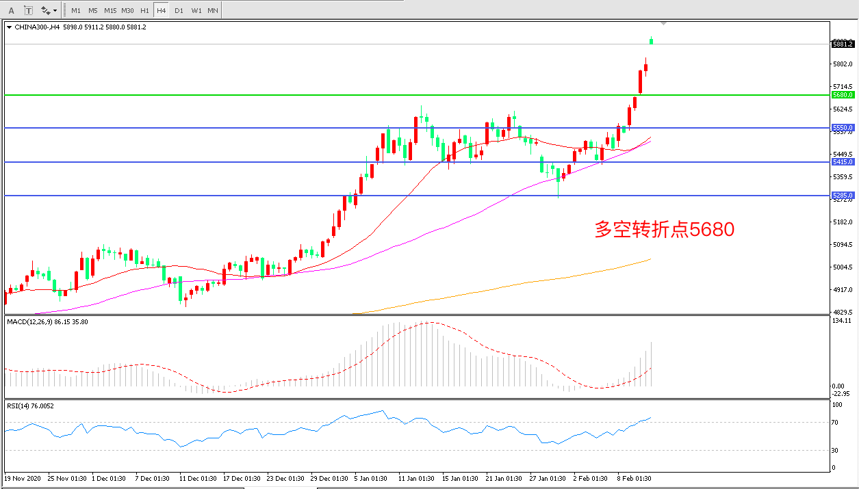 4小时图看,沪深300阳线连续拉升, 5680阻力被突破,短期表现十分强势,行情进入上行加速期,MACD红柱增加RSI指标向上,节后延续上行概率较大。