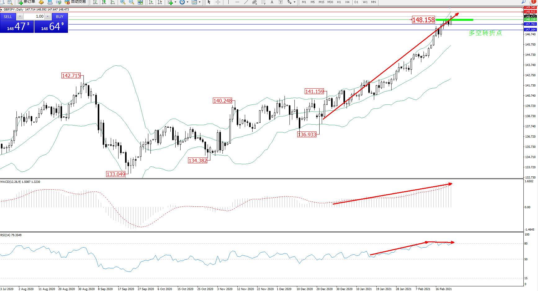 交易策略:148.158上方看涨,目标148.915、149.340