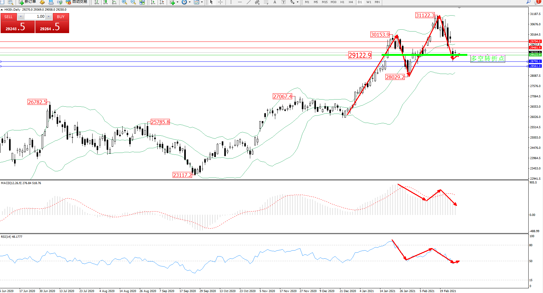 技术点评:多头动力延续布林带指标通道中上轨区间持续震荡至31122位置后遇阻回撤,纠结于中下轨区间维持震荡后有回升迹象,短期或将继续维持在布林带指标通道中下轨区间整理,空头动力下行开始有缓慢减弱态势,布林带指标呈张口走势后开始有收口迹象,MACD指标处于多头区域持续震荡缓慢下行中,RSI指标处于多头区域维持震荡回撤至50均衡线附近弱势整理中;