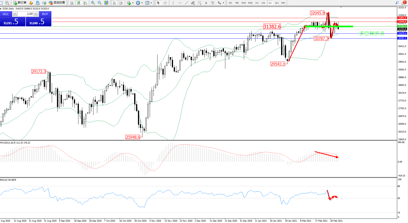道琼斯指数3月3日(周三)收盘下跌119.98点,跌幅0.38%,报31271.54点;美国密切关注的小非农ADP就业数据表现不及预期和前值,就业市场继续全面缓慢复苏,商品生产行业的就业增长正停滞。在疫情仍占主导地位的情况下,服务业仍远低于疫情前水平;然而,随着开业时间的临近和消费者信心的增强,这个行业可能会是最大的受益者。市场密切关注的,美国2月非农就业报告将于周五(3月5日)公布,目前市场预计新增就业人数为19.5万,前值为4.9万人;市场预计失业率为6.3%,前值为6.3%;市场预计美国2月平均每小时工资年率5.3%,前值为5.4%。新冠疫苗的迅速接种推动了经济快速反弹的希望,美国1.9万亿美元经济刺激计划的进展几乎没有带来喘息的机会,美联储哈克表示,不会在2022年的任何时候加息,如果要加息,可能在2023年底。缩减购债规模的策略将与上次复苏的情况类似。可能使用的工具包括收益率曲线控制。没有看到通胀率很快超过2%的迹象。
