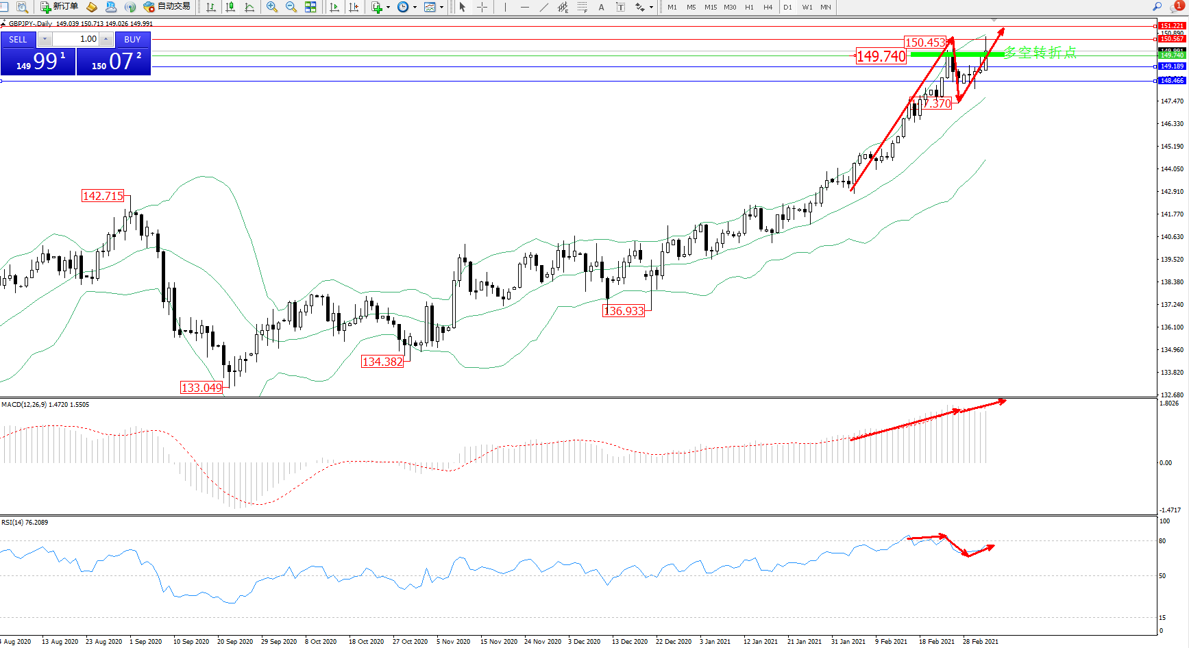 技术点评:多头动力延续布林带指标通道中上轨区间持续震荡上扬态势良好,高位短暂回撤后再度向上拉升上行,多头动力尚未有止步迹象,布林带指标呈多头上行走势持续中,MACD指标处于多头区域高位维持整理平移中,RSI指标处于超买区80均衡线下方持续整理平移中;