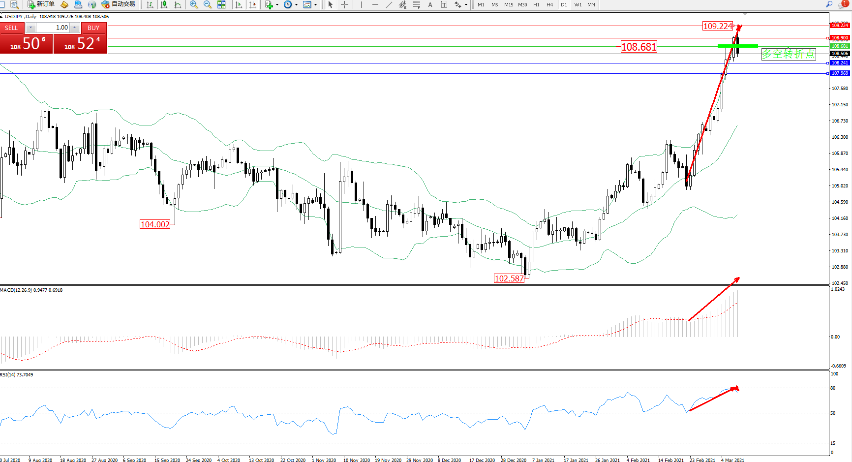 技术点评:多头动力延续布林带指标上轨附近节点持续震荡上扬,高位抵达109.224附近节点后遇阻急速反转回撤,空头动力有伺机入场态势,布林带指标呈张口走势持续中,下轨附近有反转向上移动迹象,MACD指标处于多头区域维持震荡不断上移中,RSI指标处于多头区域维持在80均衡线附近弱势整理后开始有反转下移迹象;