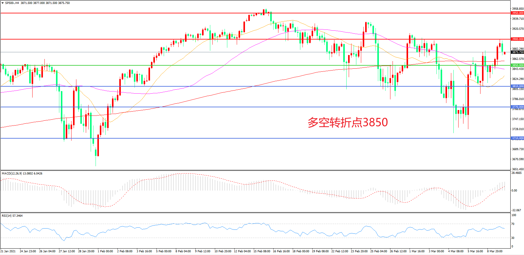 4小时图看,标普500长阳拉升,触碰3900后小幅回落,短期走势陷入震荡,均线系统走平形成下方支撑,3900成为上方阻力,    MACD红柱增加,RSI指标走平,日内延续震荡概率较大。