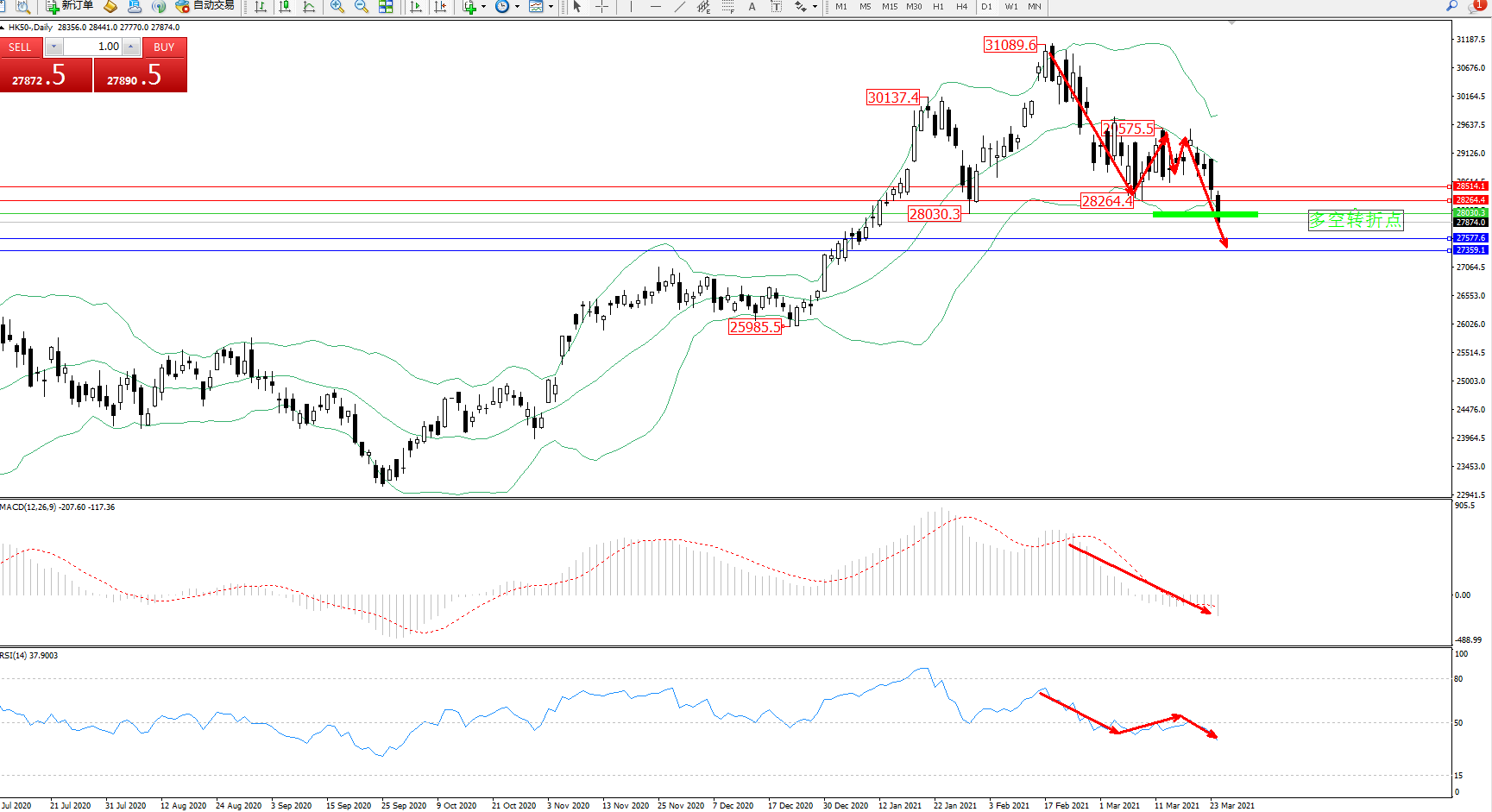 香港恒生指数3月24日(周三)收盘下跌579.24点,跌幅2.03%,报27918.14点;港股三大指数再度重挫,行业板块全线低迷,个股普遍下跌,市场亏钱效应较大。恒生科技指数跌3.07%报8040点。近期强势的物管股亦回调明显,大型科技股美团跌近4%,京东、腾讯均下跌;惟燃气股、水务股个别板块上扬。今日南下资金净流出38.77亿港元,大市成交额较昨日小幅增加至1901亿港元。据央视,由于疫苗药瓶封盖出现包装瑕疵,香港特区政府即日起暂停复必泰疫苗的接种工作,直至完成相关调查工作。香港卫生署署长陈汉仪24日表示,目前已有约15万名香港市民接种了涉事批次的复必泰疫苗,前线医护人员发现包装有异的疫苗,已立即停止接种。陈汉仪透露,今早与复星医药展开紧急会议,对方将对德国厂房至香港间的物流链开展调查。南下资金今日净卖出港股69.43亿港元,本周抛售港股逾百亿港元。今日净卖出前三个股为美团-W、小米集团-W、腾讯控股,分别遭净卖出21.83亿港元、5.64亿港元、5.57亿港元。 中国移动获净买入4.15亿港元。