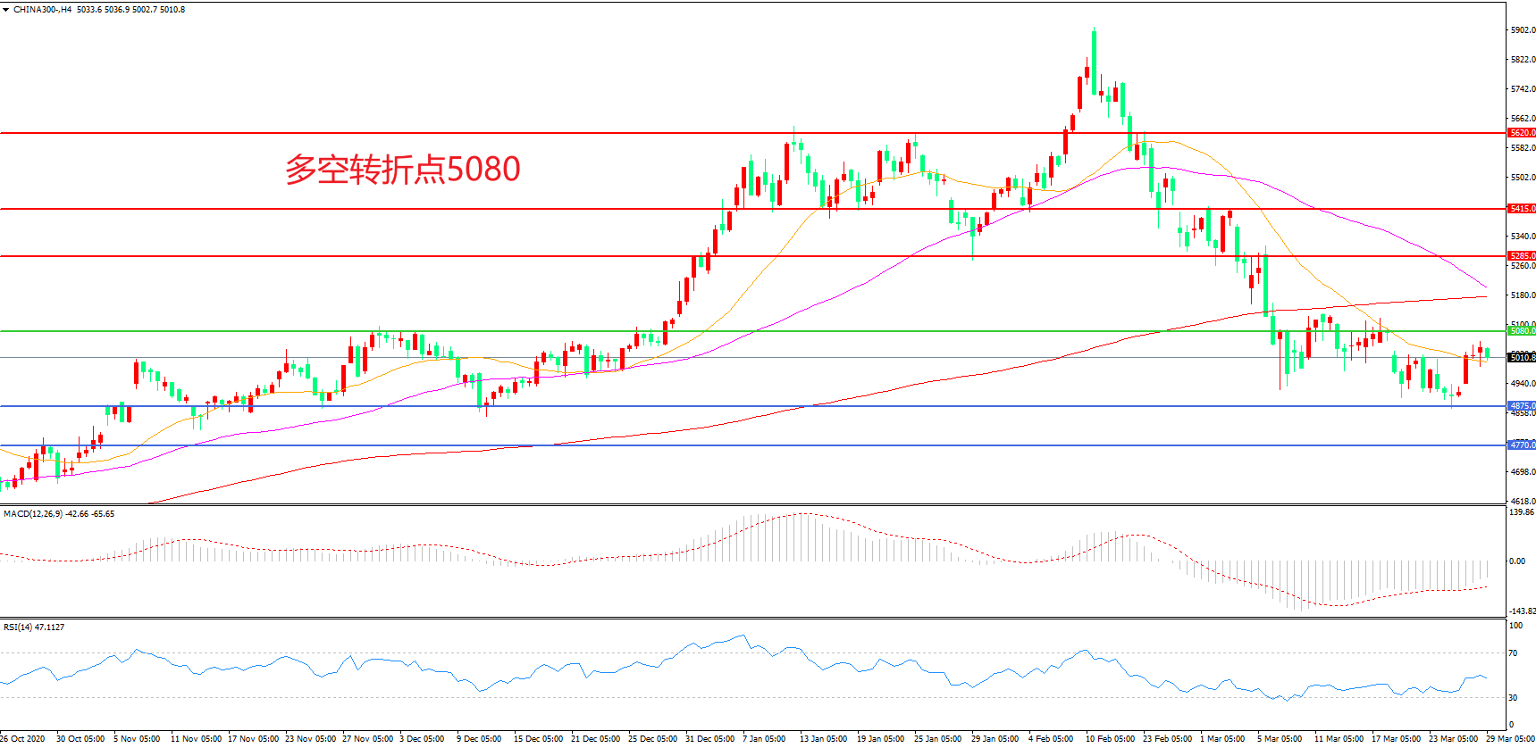周一(3月29日),受外围市场上涨影响,沪深两市早盘双双高开,高开之后惯性下探,沪深300延续低位震荡形态,收报5010.8点。两市合计成交7579亿,北向资金净卖出58.42亿。值得关注的是,在成交量不能有效放大的前提下,沪深300每一次上攻都伴随有较大的抛压。说明目前市场的谨慎情绪偏浓重,做多意愿并不强烈。