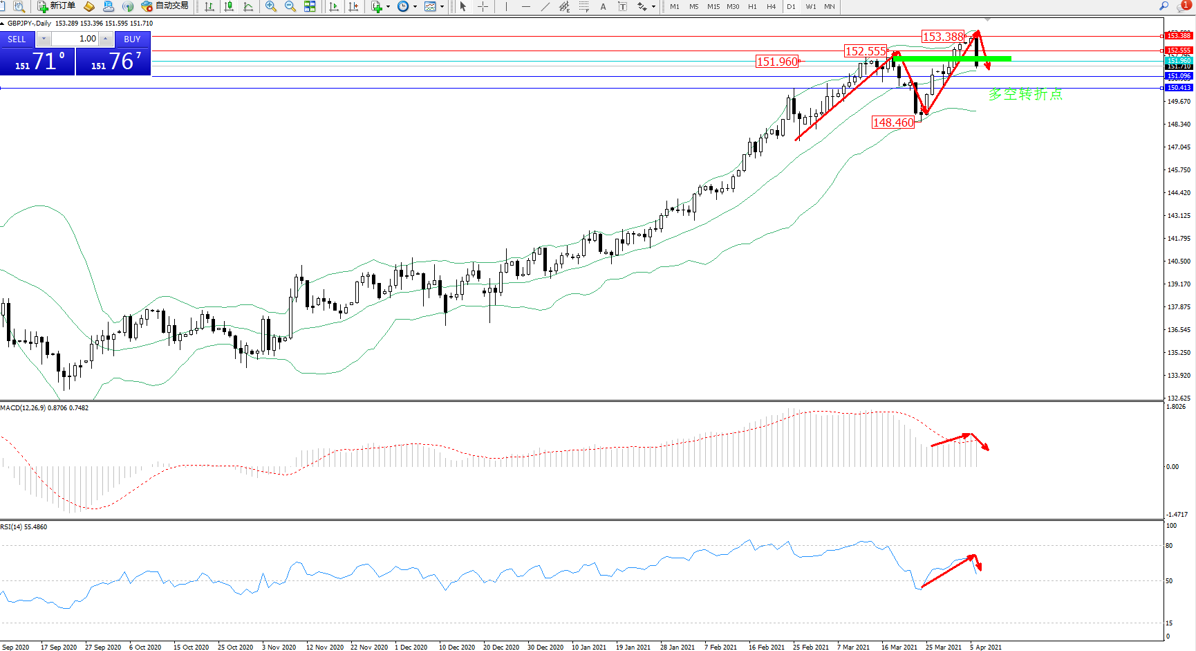 技术点评:多头动力延续布林带指标通道持续宽幅震荡向上拉升走势中,高位多次触及上轨附近节点后遇阻回撤,抵达153.388位置后下行,即将触及中轨附近节点,布林带指标呈上行拉升走势态势良好,MACD指标处于多头区域维持震荡上移后有回撤迹象,RSI指标处于多头区域维持震荡后反转急速下挫中;