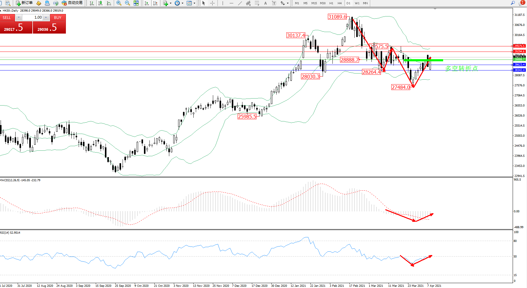 技术点评:高位空头动力延续布林带指标通道持续震荡下行,低位抵达27484附近节点后反转拉升,突破中轨进入中上轨区间震荡中,布林带指标呈收口走势后开始弱势走平,关注中轨上方附近节点,MACD指标低位多头动力弱势震荡缓慢上移中,RSI指标低位多头动力持续震荡上移至50均衡线附近弱势徘徊中;