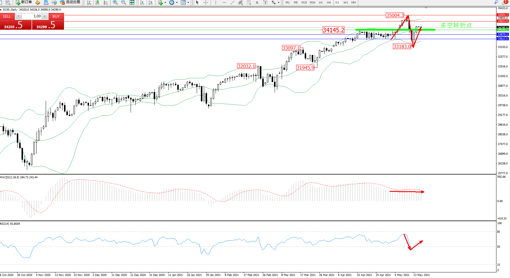 技术点评:多头动力延续布林带指标通道中上轨区间持续震荡上扬,高位抵达35004位置后遇阻回撤,跌破下轨后得到33183支撑开始反转回升,再度回升至中上福区间震荡,多头动力仍具强劲动力,关注中轨附近节点,MADC指标处于多头区域高位震荡后维持弱势整理,RSI指标空头动力急速下挫至50均衡线附近震荡再度回升中;