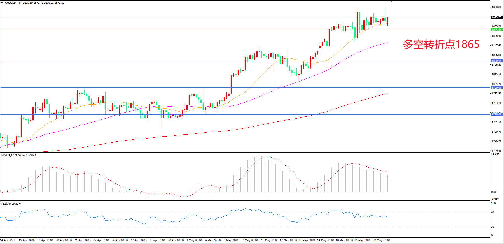 上周,虽然美联储4月纪要暗示讨论收紧政策短线给金价带来压力,但市场仍然相信美联储短期内不会紧缩,加之印度严峻的疫情形势以及加密货币市场的资金流入,金价大幅上行,一度站上1885美元,回落整理后收报1879.25美元/盎司。