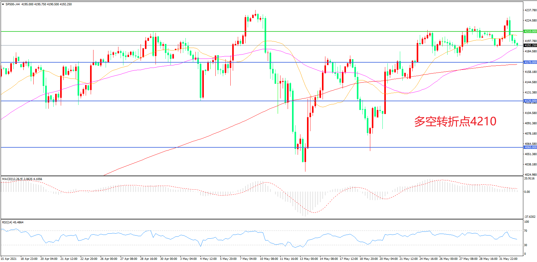 4小时图看,标普500呈现区间震荡形态,4210成为短期多空分水岭,55周期均线成为短期支撑,MACD红柱缩短,RSI指标走平,日内震荡上行概率较大。