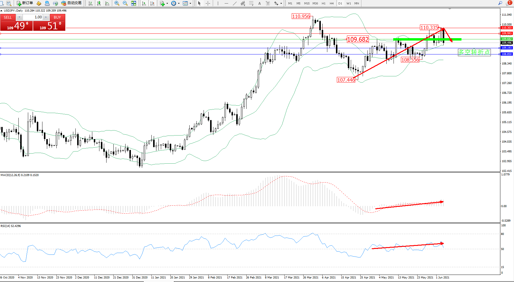 技术点评:多头动力延续布林带指标通道中上轨区间持续震荡向上拉升,触及上轨110.335附近节点后急速回撤,布林带指标依旧呈上行趋势走势良好,关注中上轨附近节点,MACD指标处于0轴线上方多头区域维持整理徘徊,RSI指标处于50均衡线上方多头区域持续震荡;