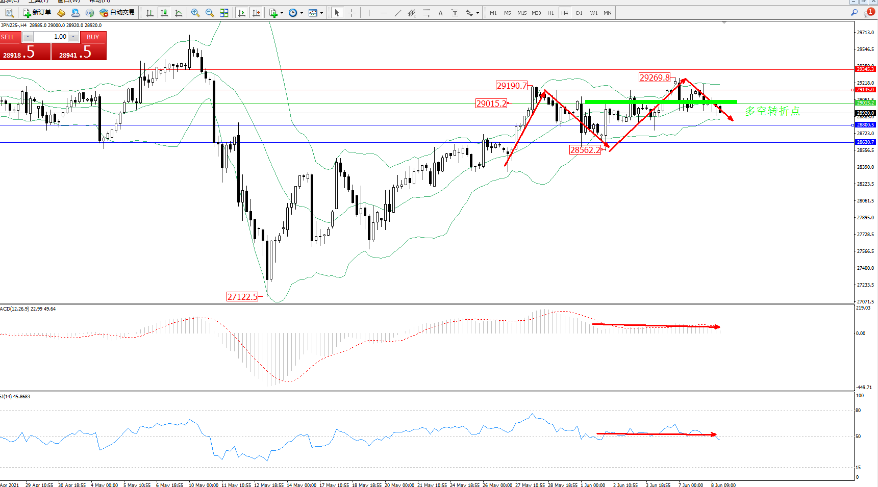 技术点评:低位多头动力延续布林带指标通道持续震荡向上移动,高位抵达29269附近后遇阻开始短暂整理回撤,即将触及布林带指标下轨附近节点,短期或将维持向下调整走势,布林带指标呈平移走势持续中,MACD指标处于0轴线上方弱势整理平移中,RSI指标处于多头区域窄幅整理后跌破50均衡线进入空头区域迹象;