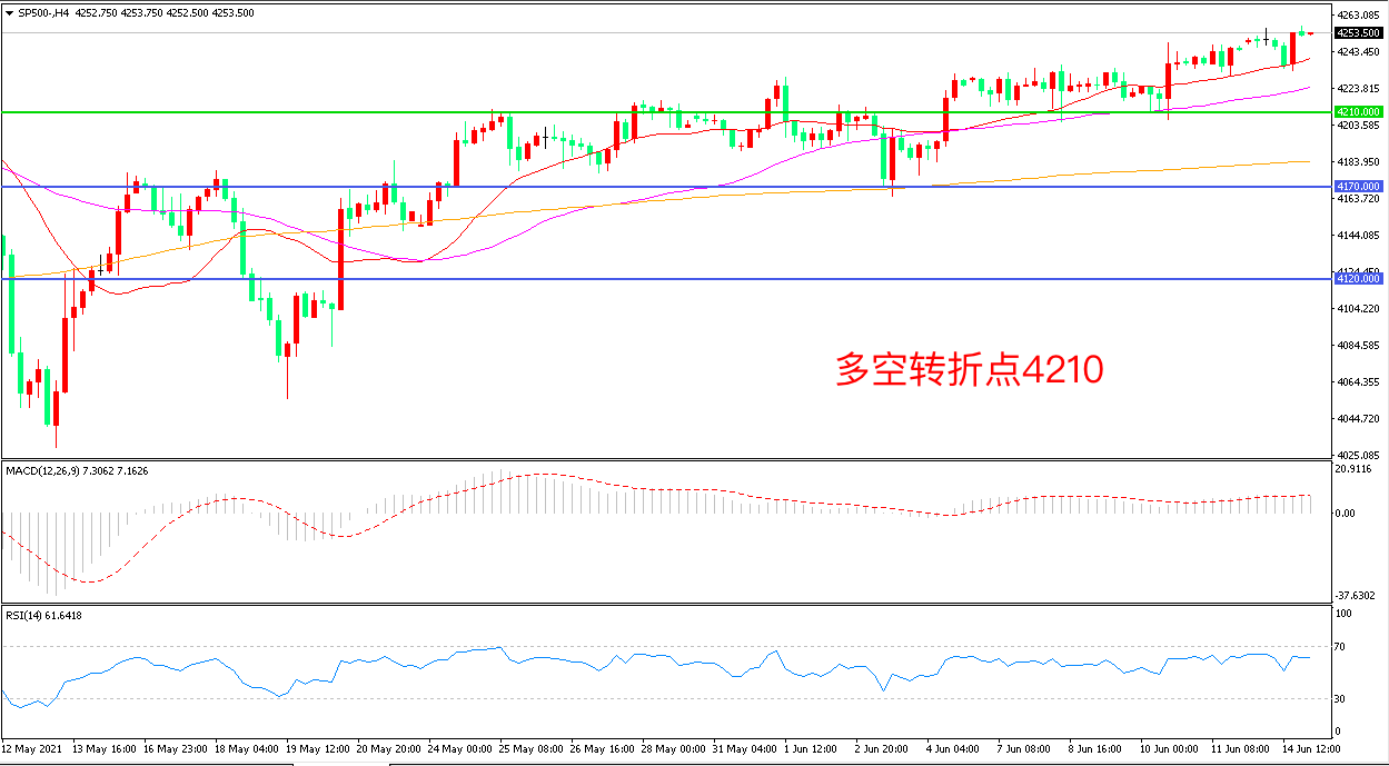 4小时图看,标普500延续高位震荡,短期表现较强,均线系统逐渐走平,4210成为短期支撑,MACD红柱增加,RSI指标走平,日内震荡上行概率较大。