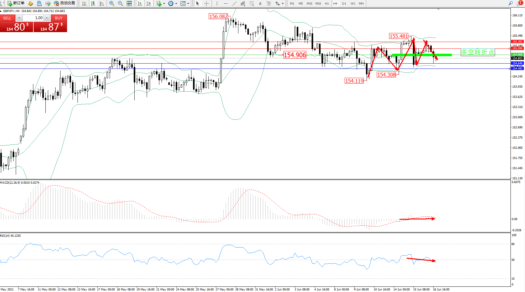 交易策略:154.906下方看跌,目标154.646、154.482