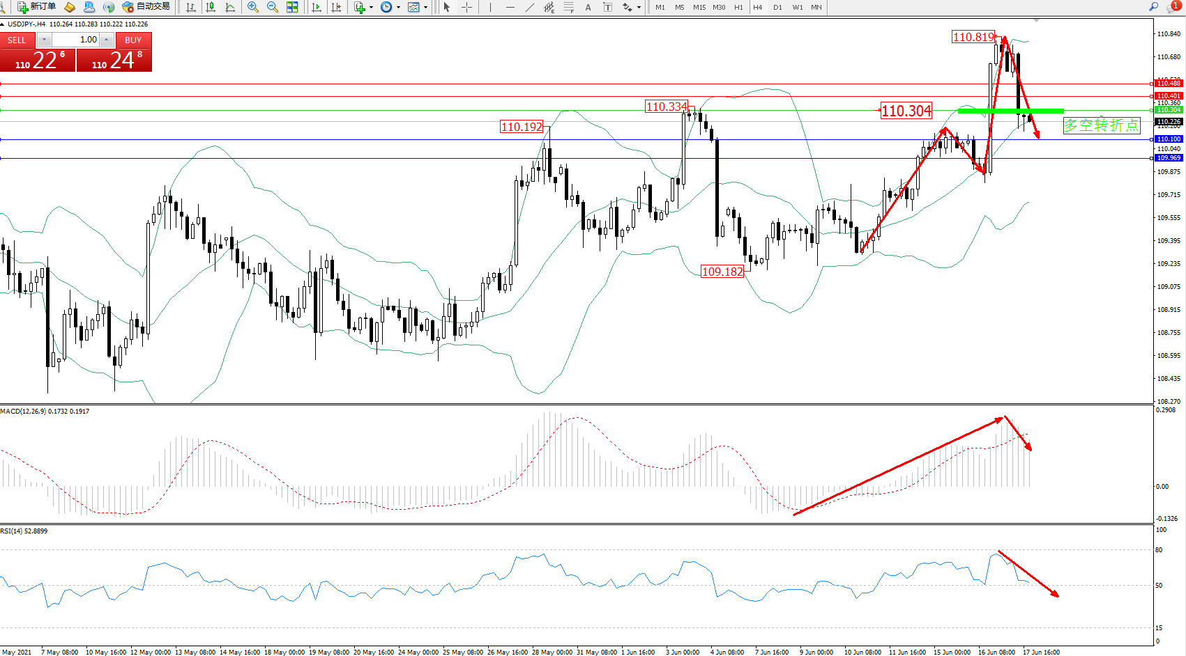 技术点评:多头动力延续布林带指标通道中上轨区间持续震荡上扬,高位抵达110.819位置后遇阻震荡回撤,触及布林带指标中轨附近节点后有进一步向下移动态势,高位受制于空头压制动力强劲,MACD指标处于多头区域高位震荡后开始反转向下移动中,RSI指标处于多头区域高位急速震荡回撤,即将触及50均衡线附近;