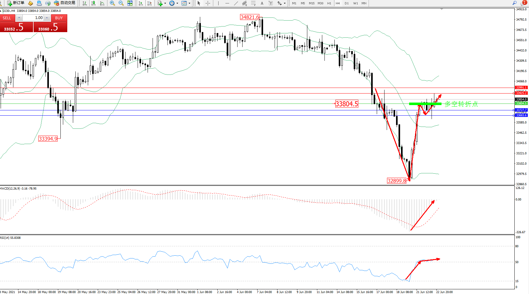 技术点评:空头动力延续布林带指标下轨附近持续震荡下行,抵达32899位置后得到支撑反转强势拉升,呈V型反转走势持续上扬中,纠结于布林带指标中上轨区间不断震荡,多头动力有进一步向上移动拉升,布林带指标呈缓慢张口走势中,MACD指标处于空头区域低位持续拉升后即将触及0轴线附近节点,RSI指标纠结于50均衡线上側弱势徘徊中;