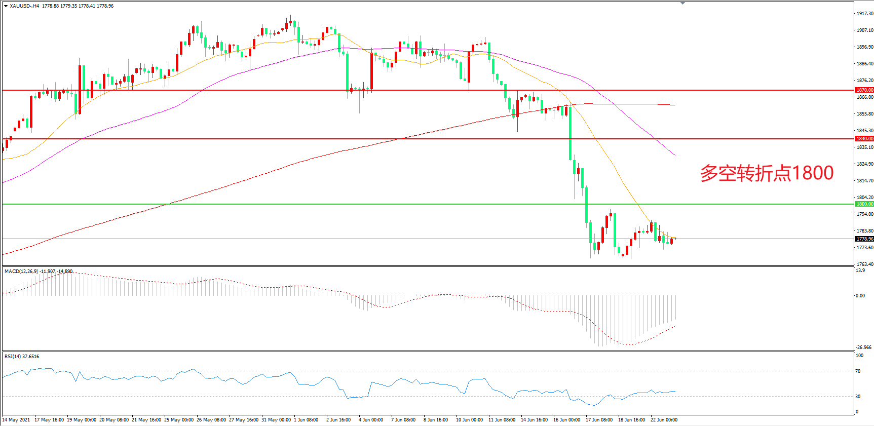 周二(6月22日),美联储主席鲍威尔在国会讲话中释放“鸽派”信号,暗示美联储在撤除宽松方面会有耐心,美元指数跌幅扩大,但金价并未受到明显提振,小幅震荡后收报1778.50美元/盎司。悲观的市场情绪令空头牢牢把握着局面,随着投机和实物需求放缓,金价可能有更多回落空间。