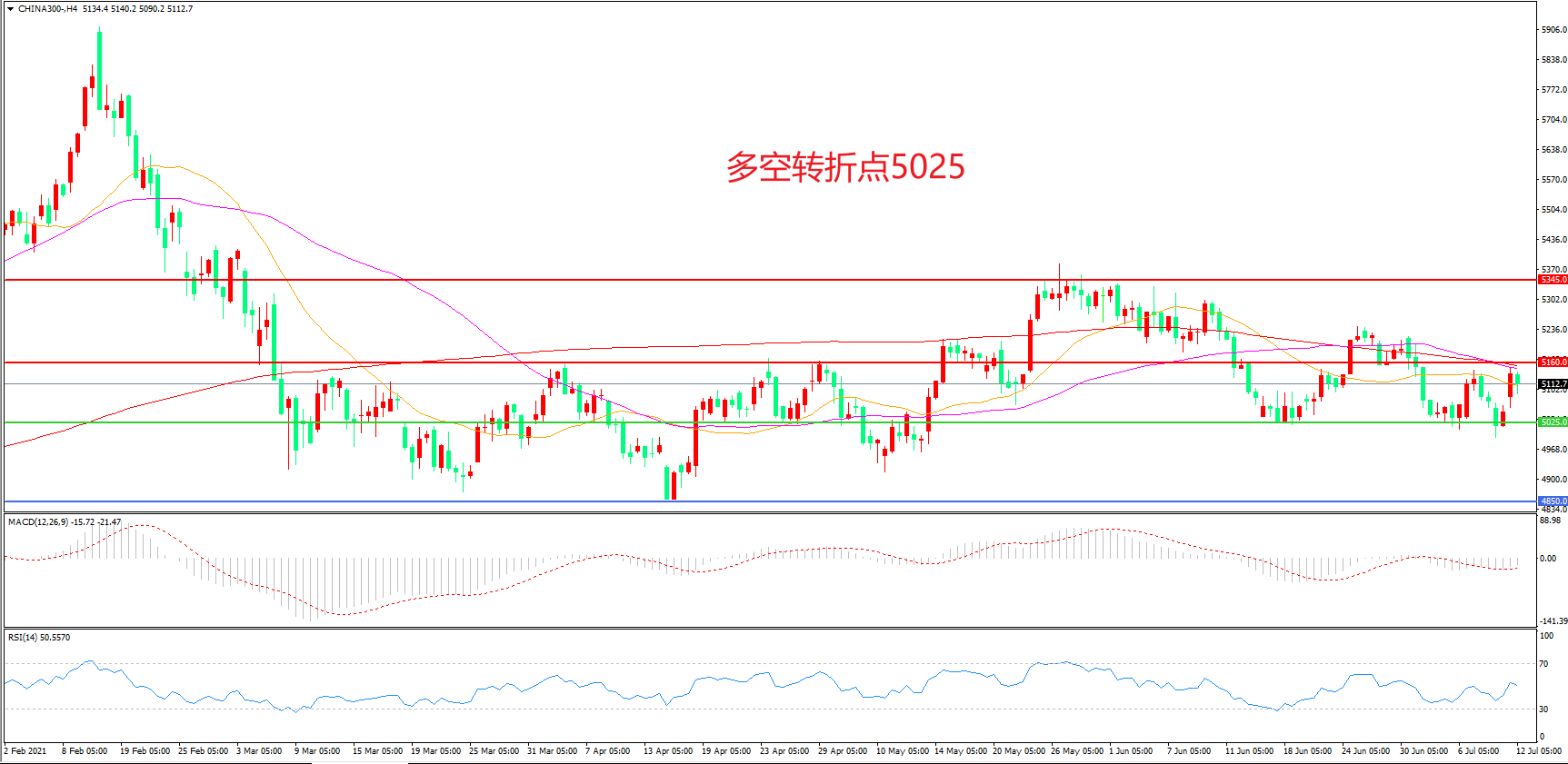 4小时图看,沪深300高开高走,整体表现有所回暖,均线系统下压成为上方阻力,5025成为下方支撑,MACD绿柱缩短,RSI指标走平,日内延续震荡概率较大。