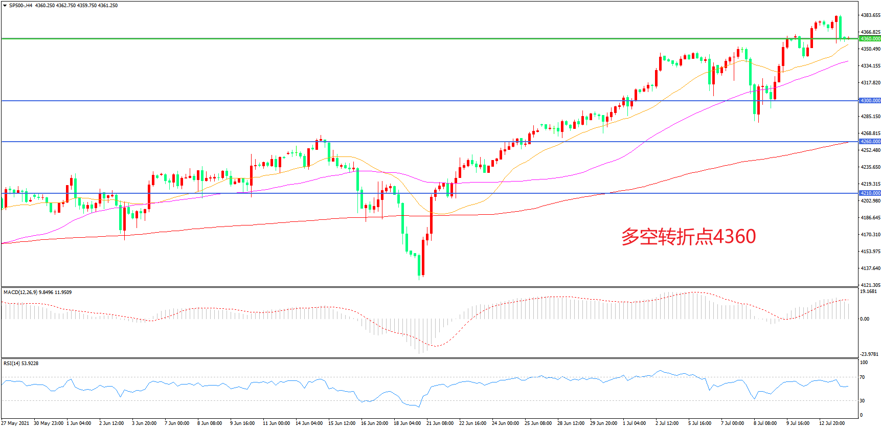 4小时图看,标普500震荡上行后大幅回落,上行趋势暂缓,4360成为多空分水岭,均线系统依然呈多头排列,MACD红柱减少,RSI指标走平,日内震荡上行概率较大。