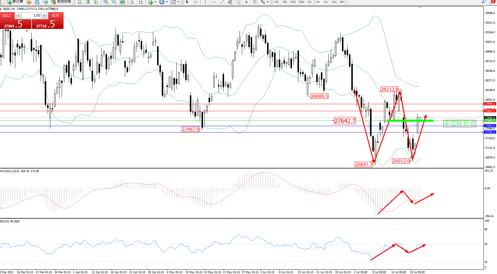 香港恒生指数7月22日(周四)收盘上涨499.26点,涨幅1.83%,报27723.84点;港股三大指数全天维持强势,结束连跌行情,市场情绪稍有回升。恒生科技指数涨2.22%报7490点。,近期连续大跌的恒大系今日全线反弹,恒大汽车大涨超20%,中国恒大升超7%重回千亿港元;大型科技股集体收涨,快手大涨近7%,美团、京东涨超3%,小米、腾讯等均有涨幅。今日大市成交额为1371亿港元,南下资金逆势净流出3.02亿港元。港府统计处公布,根据综合消费物价指数,今年6月份整体消费物价按年上升0.7%,较5月份的相应升幅1%收窄,亦低于市场预测的1.2%升幅,主要是由于政府由今年6月开始提供额外电费补贴。6月份基本消费物价通胀率微升至0.4%。由于本地疫情继续趋于稳定,有助支持消费需求,外出用膳及外卖和衣履价格的按年升幅有所扩大。