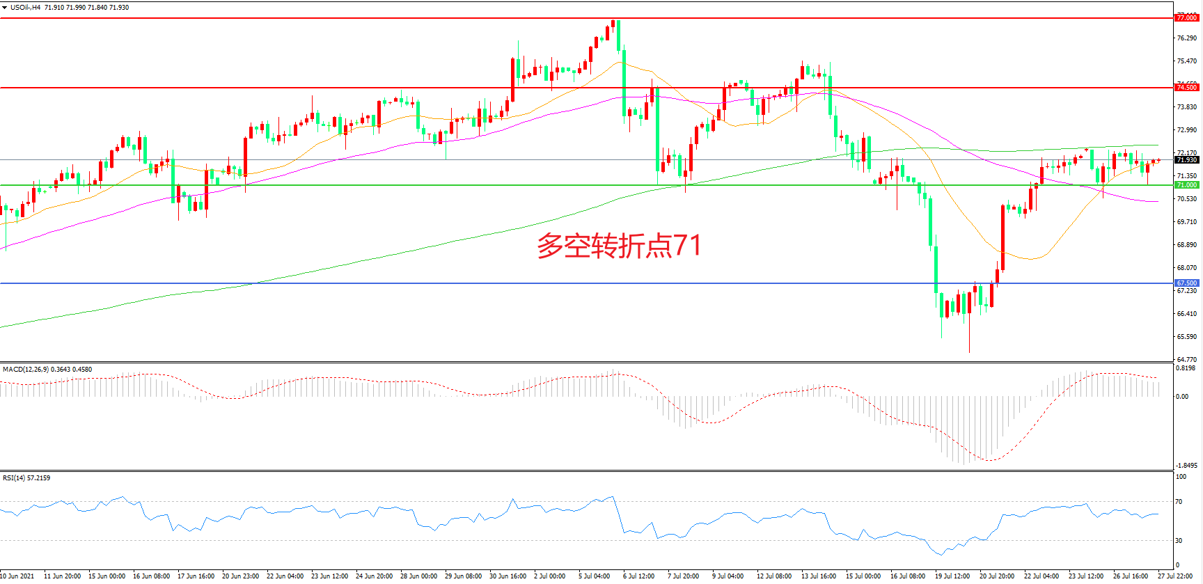 周二(7月27日),供应紧张和经济复苏放缓担忧相互抵消,原油市场在经历巨幅波动后暂时放缓,美国WTI原油窄幅震荡,收报71.95美元/桶。周三(7月28日)凌晨,根据美国能源协会公布的数据显示,当周API原油库存下降470多万桶,其中汽油库存下降600多万桶,精炼油库存下降188万桶,如果EIA数据与此表现一致,那么对原油价格将是一个极大的支撑作用。当前的原油价格正处于寻找方向的关键阶段,数据表现对多空双方的影响至关重要。