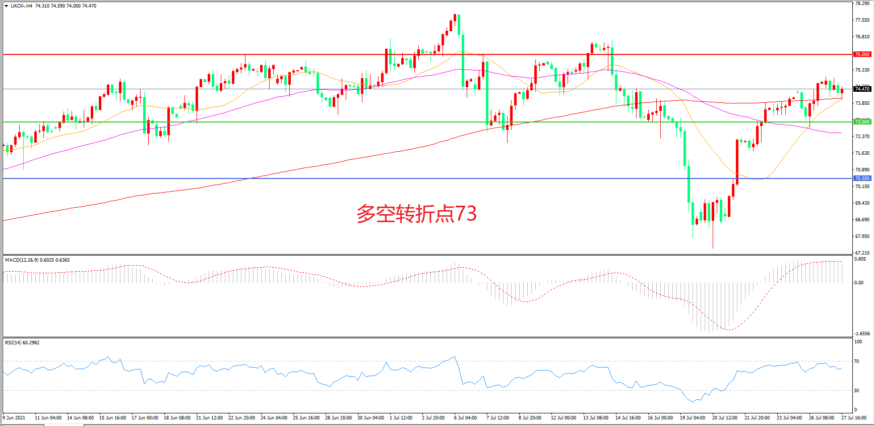 周二(7月27日),供应紧张和经济复苏放缓担忧相互抵消,原油市场在经历巨幅波动后暂时放缓,布伦特原油窄幅震荡,收报74.47美元/桶。周三(7月28日)凌晨,根据美国能源协会公布的数据显示,当周API原油库存下降470多万桶,其中汽油库存下降600多万桶,精炼油库存下降188万桶,如果EIA数据与此表现一致,那么对原油价格将是一个极大的支撑作用。当前的原油价格正处于寻找方向的关键阶段,数据表现对多空双方的影响至关重要。