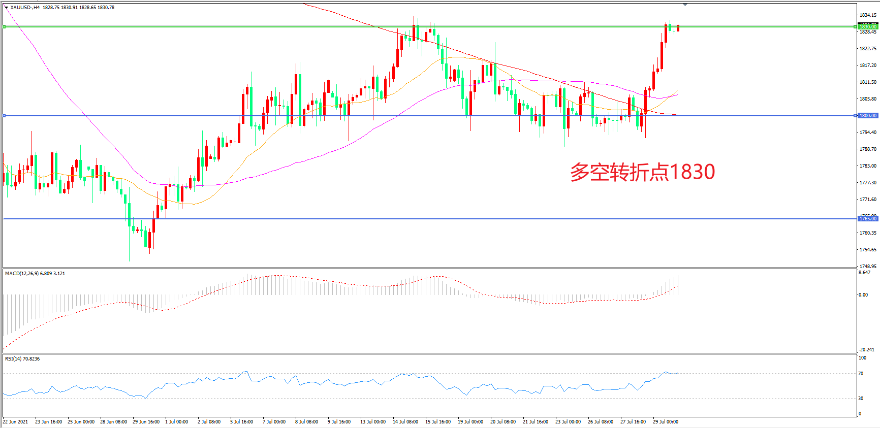 周四(7月29日),美国经济数据意外“爆冷”,二季度GDP增速远低于市场预期,美元指数跌至近一个月低位,现货黄金大幅拉升,收报1829.92美元/盎司。在美联储宣布维持政策不变后,美联储主席鲍威尔的鸽派发言提升了市场对于未来通胀的预期,汹涌而来的通胀和流动性对金价形成了明显支撑。
