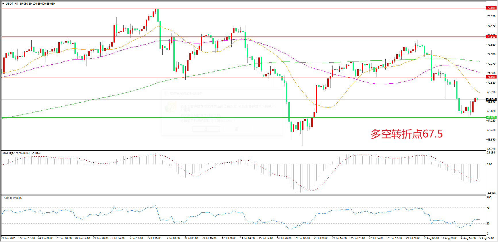 4小时图看,油价低回踩67.5一线获得支撑,但整体表现依旧低迷,均线系统成为上方阻力,67.5美元成为多空分水岭,MACD绿柱增加,RSI指标走平,日内震荡下行概率较大。