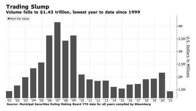 尽管新发行的州和地方政府债券的规模超过了去年的记录,但交易活动已经相当枯竭。根据数据显示,今年以来,债券交易量已经下跌了34%,至1.43万亿美元,创下22年来的新低。