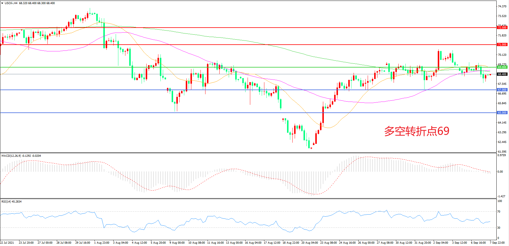 4小时图看,油价围绕着55周期均线窄幅震荡,69美元成为多空分水岭,MACD红柱缩短,RSI指标走平,日内震荡上行概率较大。