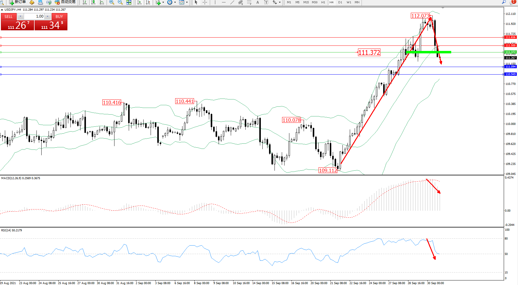 交易策略:111.372下方看跌,目标111.094、110.949