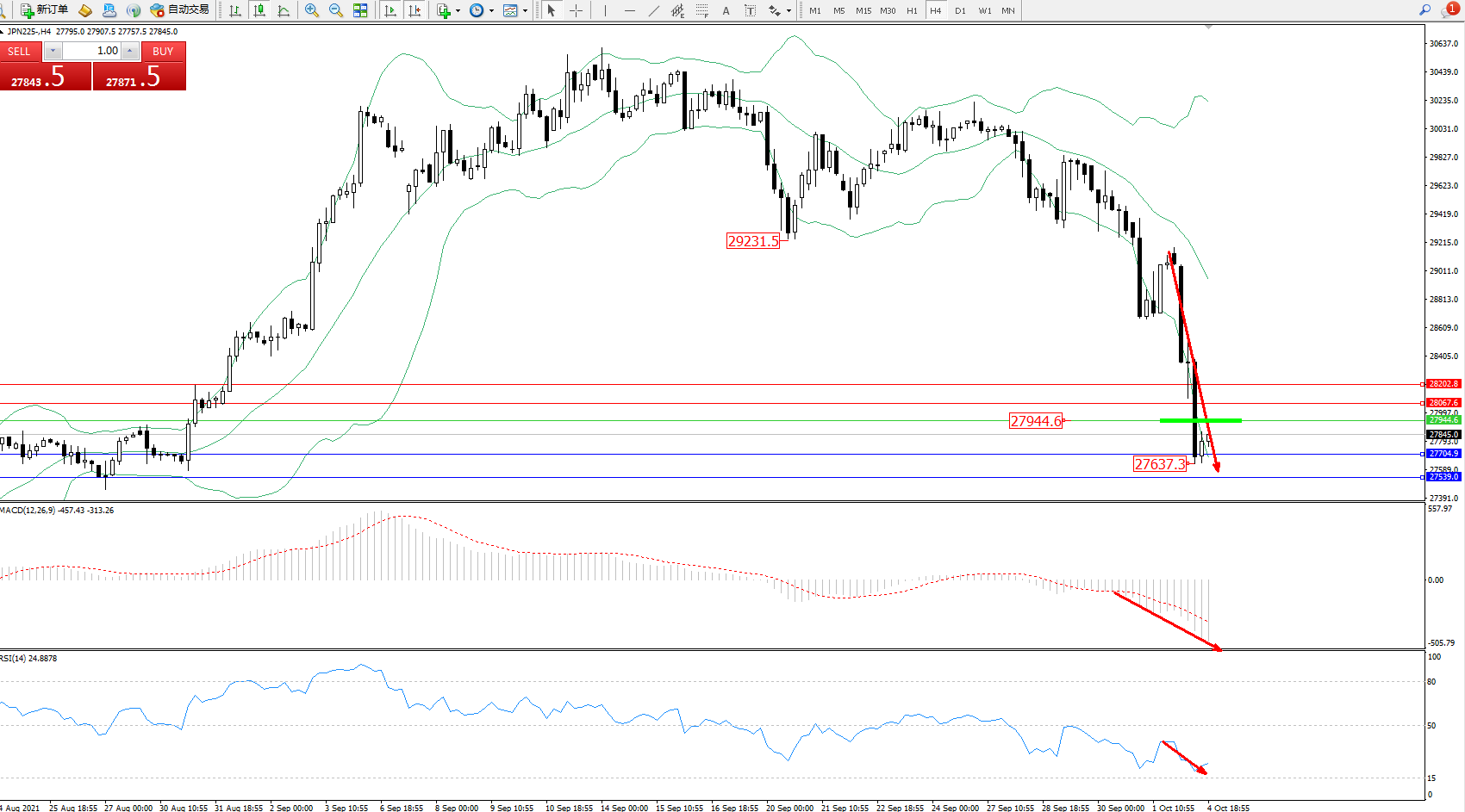 技术点评:空头动力延续布林带指标下轨附近持续震荡下挫,低位抵达27637位置后短暂得到支撑开始整理,下行态势良好,短期未见最终止步迹象,布林带指标呈张口走势持续中,MACD指标处于空头区域持续震荡下行,RSI指标处于空头区域维持震荡向下移动;