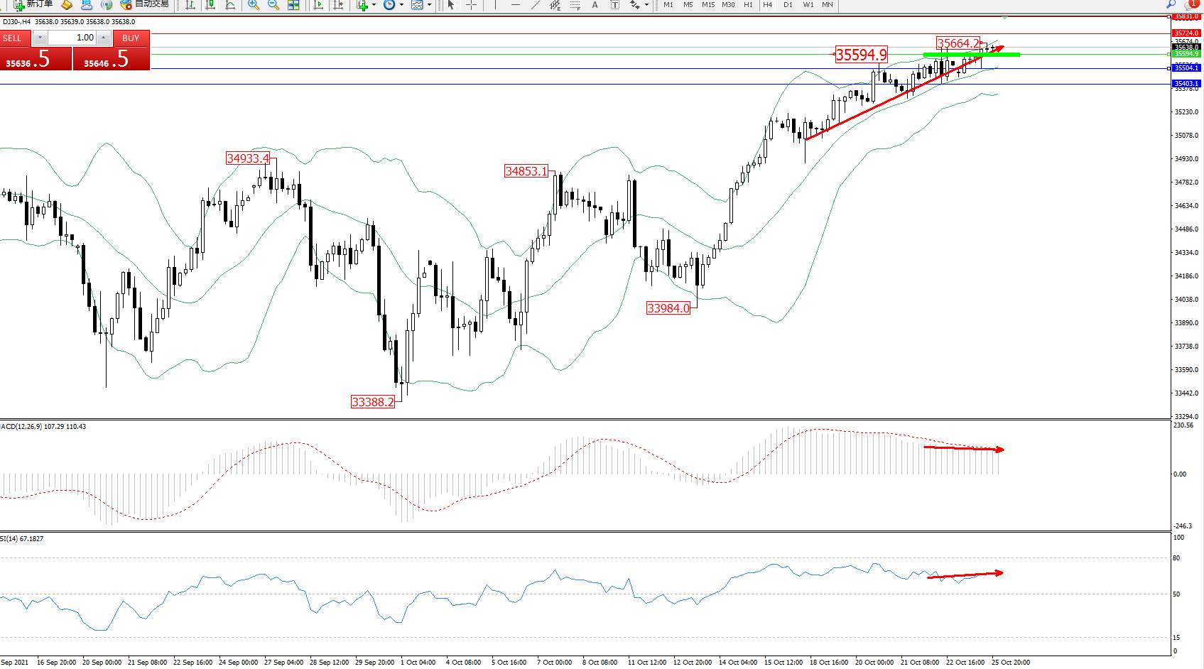 技术点评:多头动力延续布林带指标通道中上轨区间持续震荡上扬,高位抵达35664位置后持续整理向上移动,短期多头动力并未有止步迹象,布林带指标呈上行趋势走势良好,MACD指标处于多头区域维持整理平移,RSI指标处于多头区域维持弱势徘徊中;