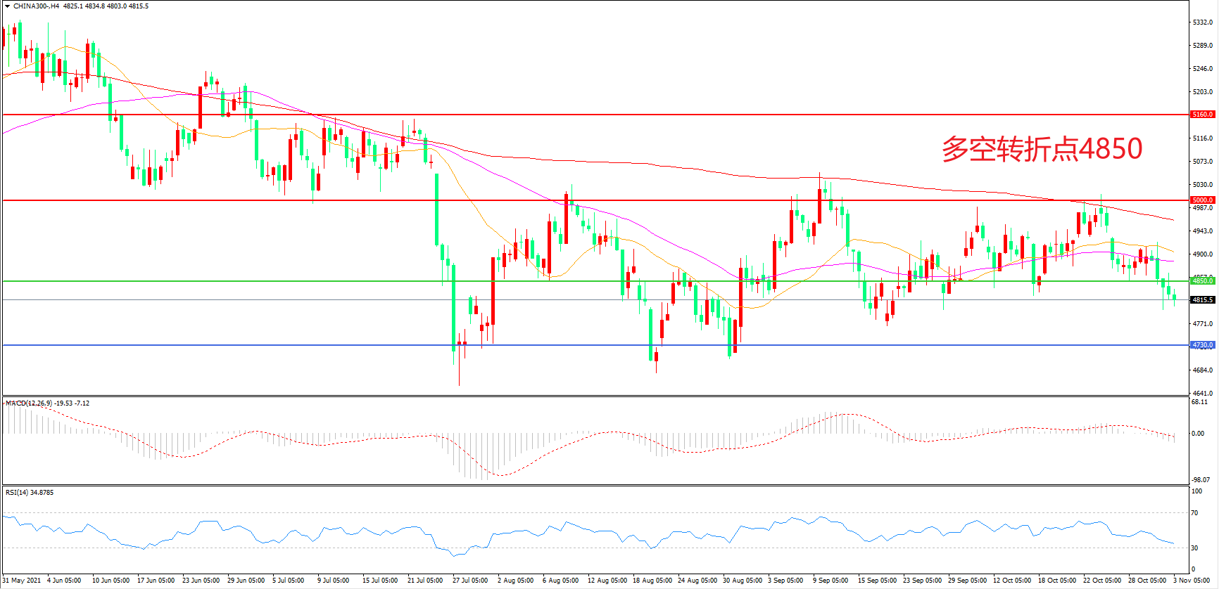 4小时图看,沪深300跌破4850后延续弱势震荡 ,整体表现较为低迷,均线系统呈空头排列,MACD绿柱增加,RSI指标走平,日内震荡下行概率较大。