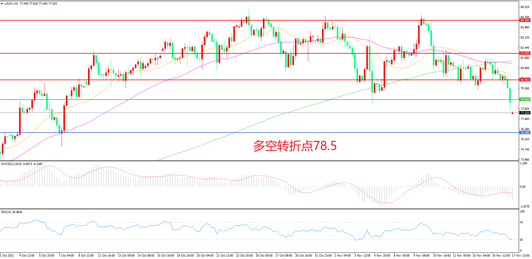 4小时图看,油价弱势震荡后破位大跌,短期走势十分低迷, 78.5美元成为多空分水岭,MACD绿柱增加,RSI指标向下,日内震荡下行概率较大。
