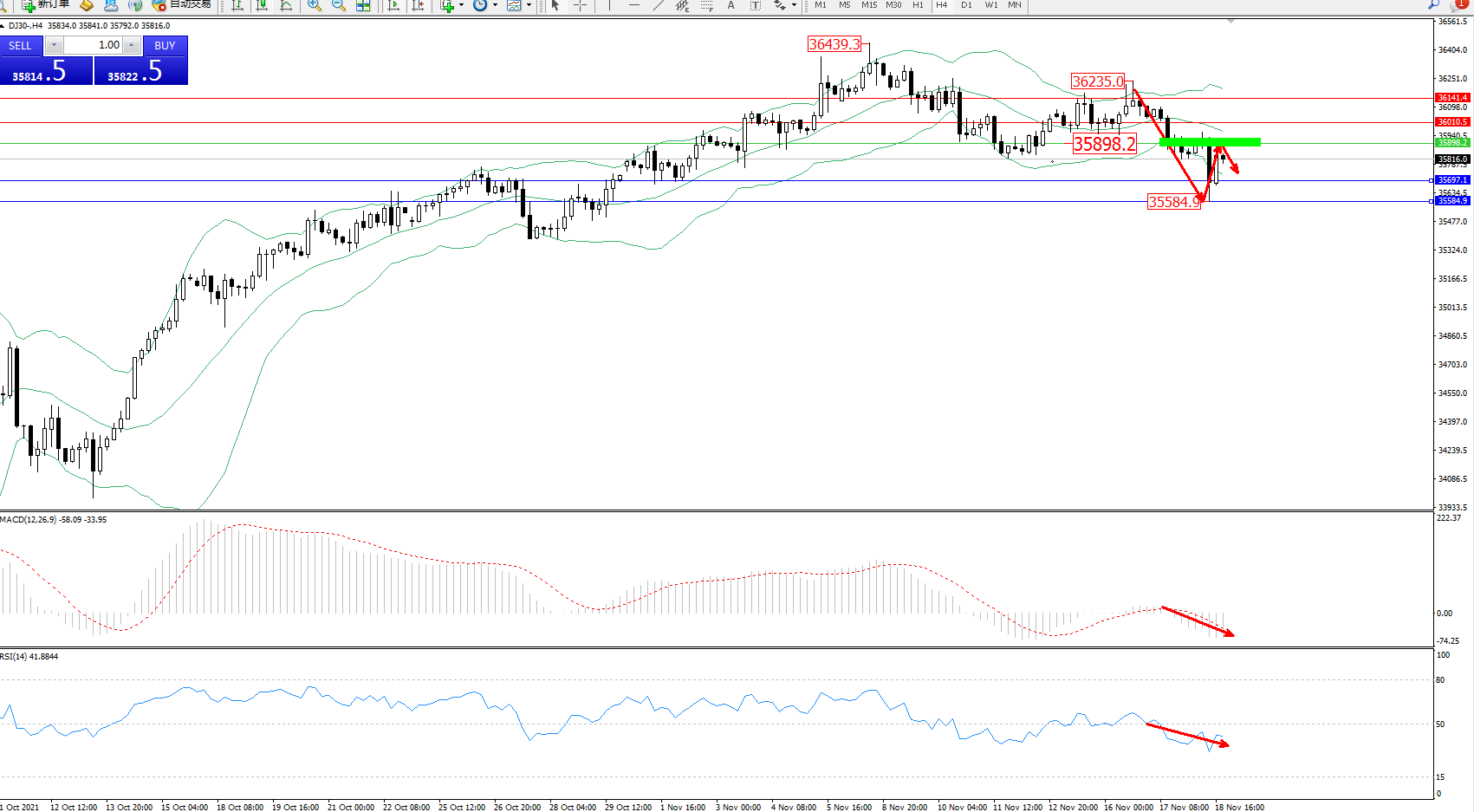 技术点评:空头动力延续布林带指标通道中下轨区间持续震荡下行,低位抵达35584位置后短暂回升,但整体下行趋势走势良好,布林带指标呈张口走势持续向下移动中,MACD指标处于0轴线下方空头区域维持整理平移,RSI指标处于50均衡线下方空头区域持续震荡徘徊中;