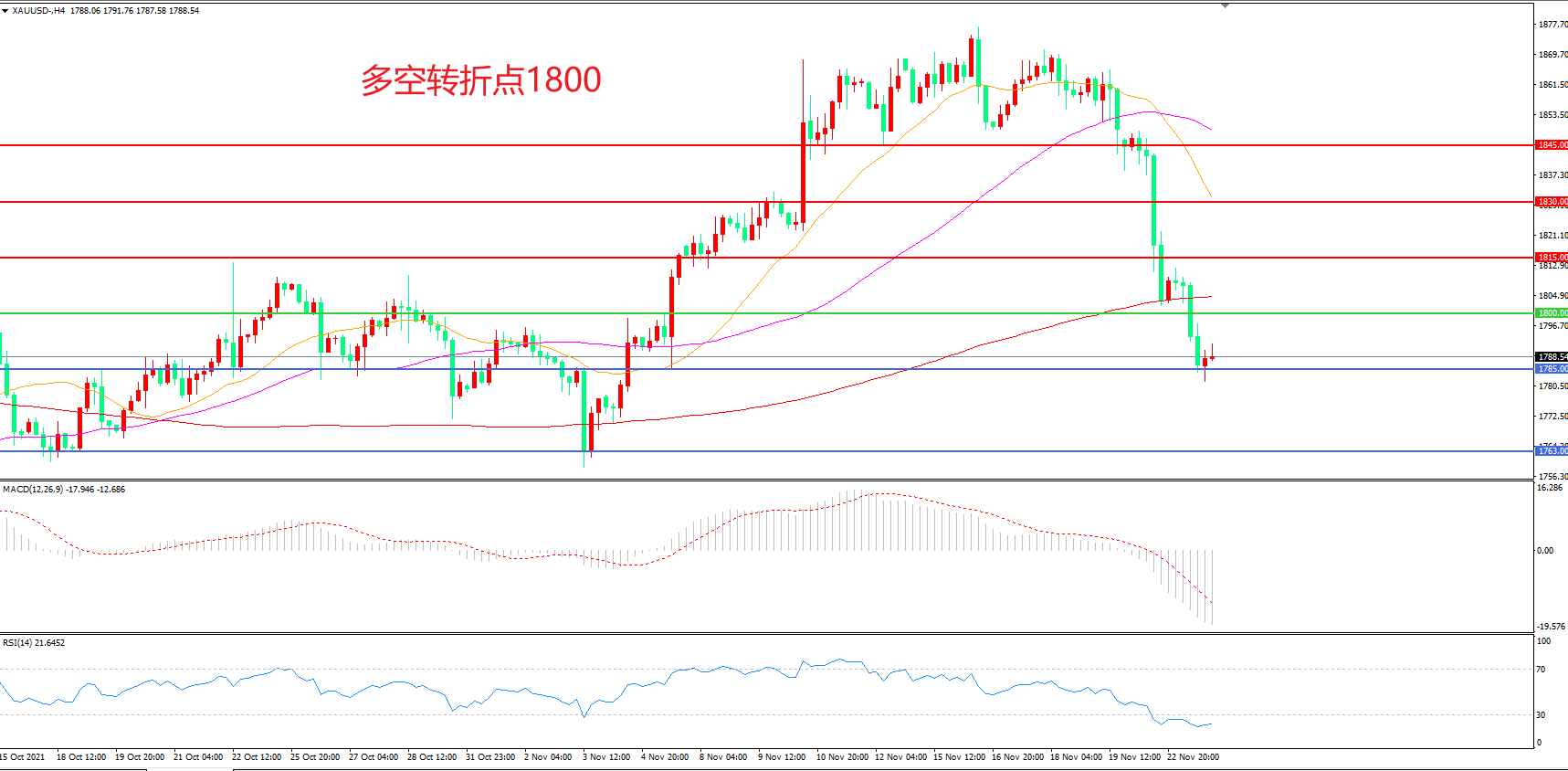 周二(11月23日),鲍威尔获拜登提名连任美联储主席后,投资者押注美联储可能加快削减刺激措施的步伐,美债收益率上行继续施压金价,现货黄金跌破1800关口,收报1788.74美元/盎司。目前美联储高官不断放出“鹰派”发言,预计随着美联储正式削减QE,美元流动性总量收缩会带动美元实际利率回升,对金价形成更大压力。