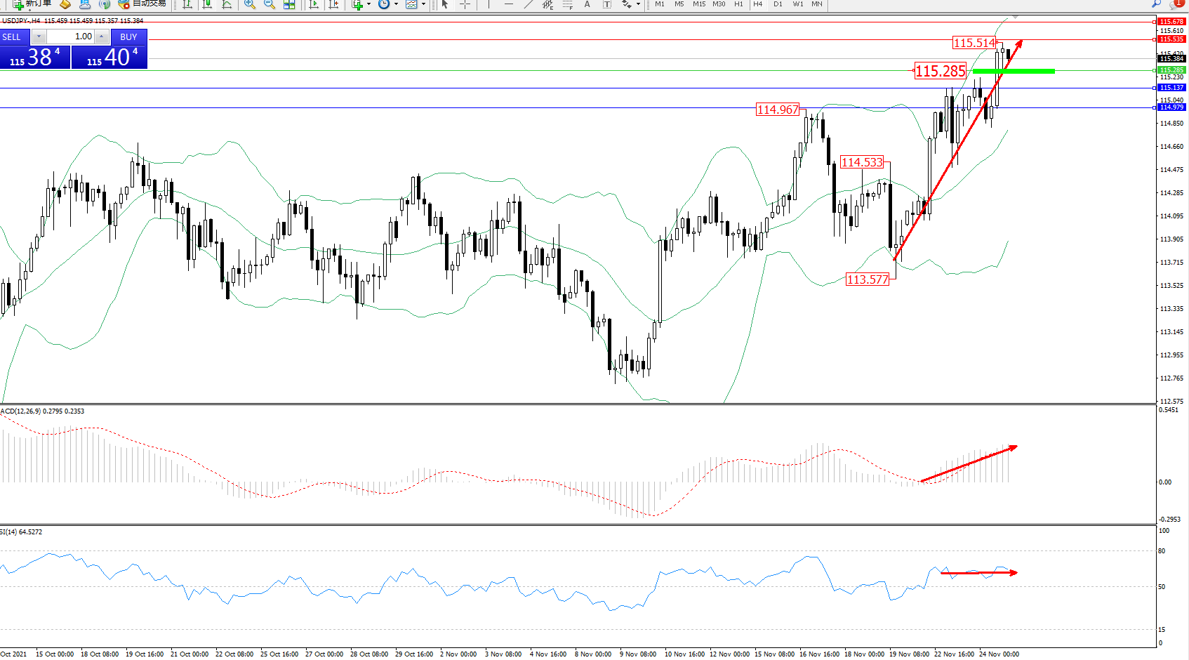技术点评:多头动力延续布林带指标通道中上轨区间持续震荡上扬,高位抵达115.514位置节点后整理,短期多头动力有继续攀升态势,布林带指标呈张口走势后开始有收口迹象,MACD指标处于多头区域维持整理上移中,RSI指标处于多头区域持续整理平移;